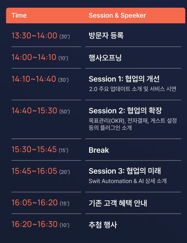Swit 2.0을 한발 빠르게 만나서 알아보고, 맞춤형 데모도 가능한 오프라인 세미나 참석을 원하는 고객은 여기로 신청하면 됩니다.